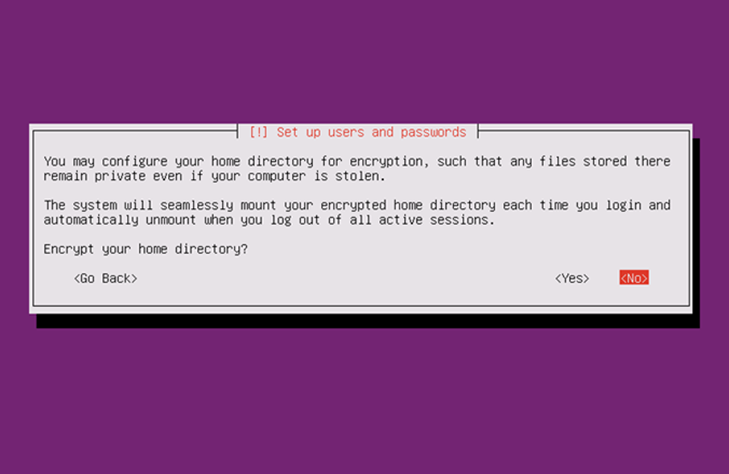 Oluşturduğunuz kullanıcı için /home directory altında bir klasör oluşturuldu isterseniz bu klasörü Encrypt hale getirebilirsiniz. Ben hayır diyerek geçiyorum.