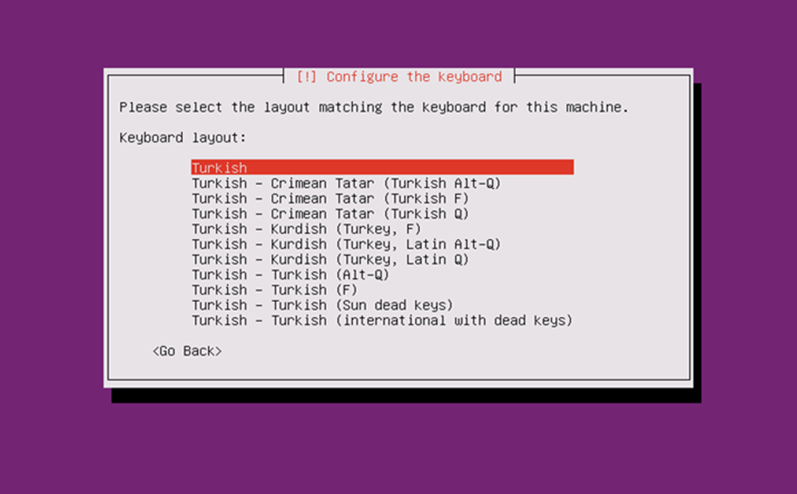 Diğer adımımızda Klavye seçeneklerini karşımıza çıkacak. Bu ekranda Turkish Seçeneğini seçerek devam ediyoruz.