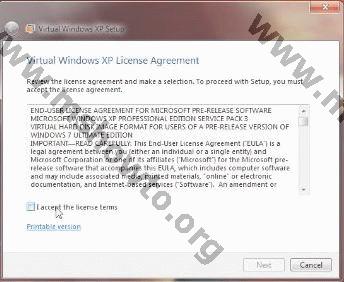 1-) Start > All Programs > Windows Virtual PC > Virtual Windows XP’ yi çalıştırın. Açılan pencerede lisans sözleşmesini kabul edip next ile devam edin.