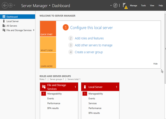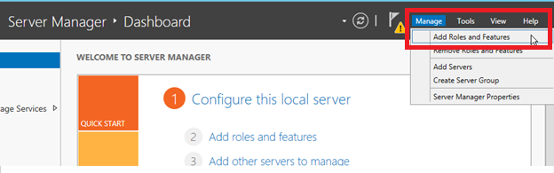 Bir alternatif olarak da, Server Manager da, sağ üst bölümde bulunan Manage düğmesine tıklayarak, Add Roles and Features a tıklayarak wizard ı çalıştırabilirsiniz.
