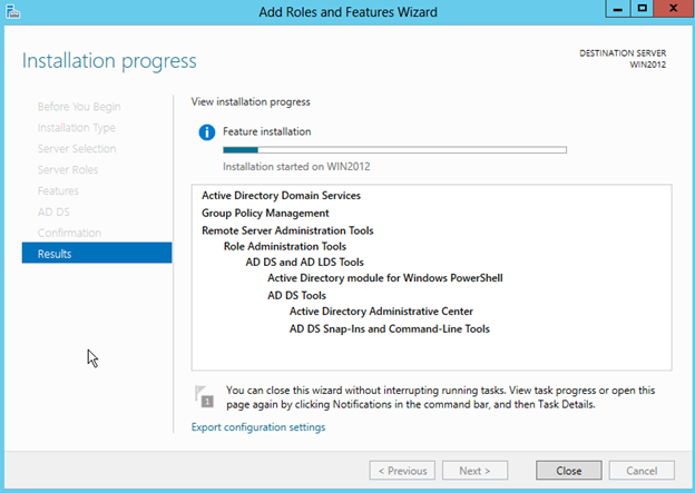 Install düğmesine tıkladıktan sonra aşağıdaki gibi Active Directory Domain Services kurulumu başlayacaktır.