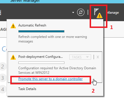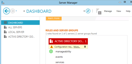 Server açıldıkdan hemen sonra Server Manager ı tekrar açınız.Notification ekranına tıkladıktan sonra ” Configuration Required for Active Directory at Server adı” şeklinde bir uyarı göreceksiniz. Active Directory kurulumuna devam etmek için, “Promote this Server to a domain controller” tıklayınız,