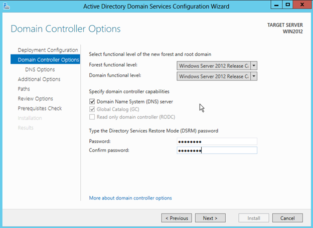Bu yaptığımız kurulum ortamımızdaki ilk Domain Controller olduğu için Global Catalog (GC) seçili olarak gelecek ve Read Only Domain Controller (RODC) seçilemez olarak gelecektir