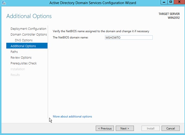 Aşağıdaki ekranda göreceğiniz, Additional Options kısmında domain imiz için kullanacağımız NETBIOS name ini belirliyoruz.