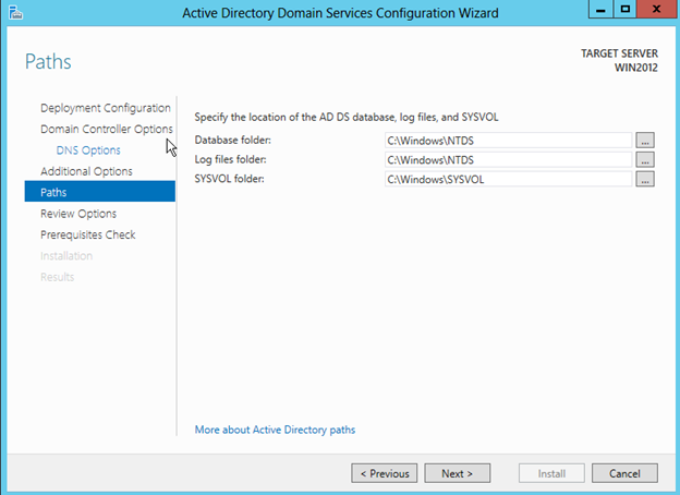 Paths kısmında AD DS database imiz, log file larımız ve SYSVOL içeriğimiz için location larımızı belirliyoruz, NEXT düğmesine tıklayarak devam ediyoruz.