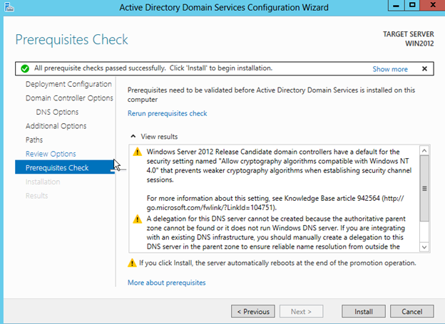 Prerequisities Check kısmında, Windows 2012 Server ımız Active Directory prequisites check yaparak herhangi bir problem yada eksiklik denetimi yapacaktır. Test ler tamamlandıkdan hemen sonra “All Prerequisite check passed succesfully. Click install to begin installation” mesajını göreceksiniz, INSTALL düğmesine tıklayarak kurulumu başlatabilirsiniz, Kurulum tamamlandıktan sonra Server ınız restart edecek ve Active Directory kurulumunuz tamamlanmış olacaktır.