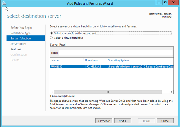 Select Server ekranında Active Directory kurulumunu yapacağımız Server ımızı seçiyoruz. Windows 2008 R2 ve önceki sürümlerden farklı olarak artık, network üzerinden diğer sunucularımıza uzaktan kurulum yapabiliyor olacağız. Bu özellik de bize ortamdaki Windows 2012 Server larımızı, Add other Servers to manage tıklayıp, Server Pool umuza ekleyerek, uzaktan merkezi olarak role ve feature kurulumu yapmamızı ve yönetmemizi sağlayacaktır.
