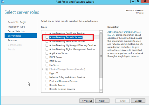 Active Directory kurulumunu başlatabilmemiz için, Select Server Roles ekranında Active Directory Domain Services ı seçiyor ve NEXT düğmesine tıklıyoruz.
