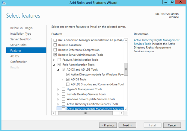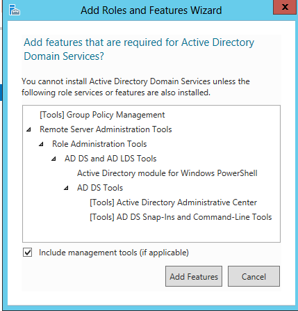 Next düğmesine tıkladığımızda “Active Directory Domain Services” kurulumu yapabilmemiz için yüklenmesi gereken bazı feature lar karşımıza gelecektir. Bu feature lar Group Policy Management tool ve Remote Administration Tools altında bulunan Active Directory Module for Windows Powershell, Active Directory Administrative Center , AD DS Snap-Ins and Command Line Tools’ dur. Aşağıdaki ekranda göründüği gibi Add Features düğmesine tıklayarak, bu modülleri seçmiş oluyoruz.