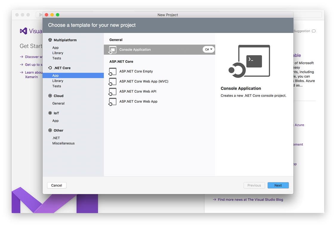 Kurulum tamamladıktan sonra Visual Studio for Mac’i başlatalım. Windows’taki arayüze benzer bir arayüze sahip diyebiliriz.