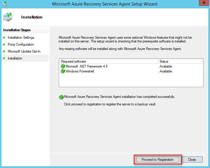 Microsoft Azure Recovery Services Agent kurulumu başarılı bir şekilde tamamlanmıştır. Proceed to Registration seçeneği ile Register işlemini gerçekleştireceğiz.