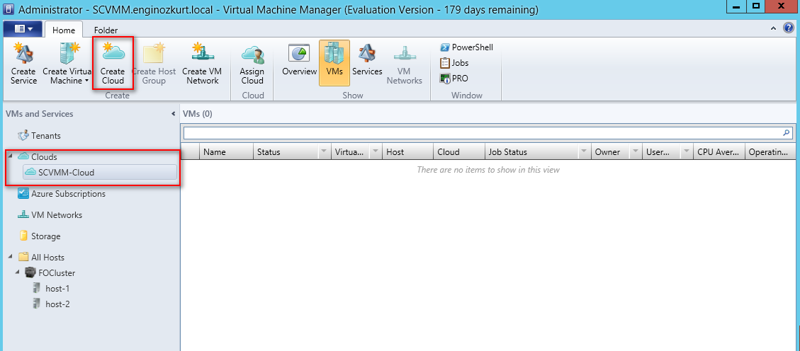 VMM Server Administrator konsolunu açıyoruz. Create Cloud seçeneği ile yeni bir Cloud koruması oluşturabilirsiniz. Bu senaryon da tüm operasyon Azure üzerinden yönetilmektedir. On-Premises ortamımızda bulunan Hyper-V Data’larını ise oluşturacağımız Cloud sayesinde Azure üzerinde görmekteyiz.