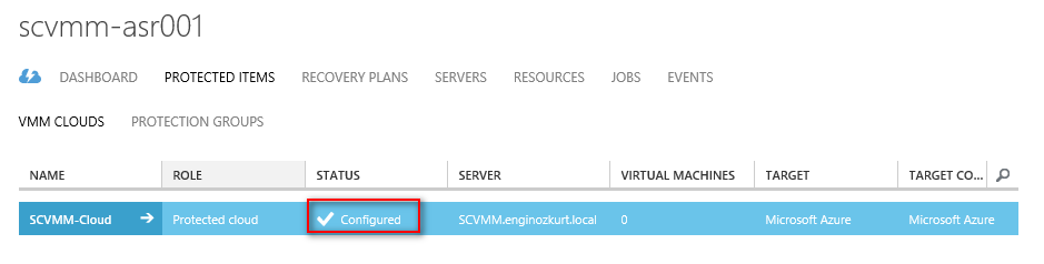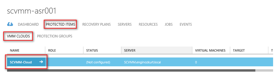 VMM Server konsolunda Cloud koruması oluşturduktan sonra Site Recovery Vault “scvmm-asr001” içerisine giriyoruz. Protected Items > VMM Clouds sekmesi altında VMM üzerinde oluşturduğumuz “scvmm-cloud” adı ile görebilmekteyiz. Status ve Virtual Machines kısımlarına baktığımız konfigürasyonun yapılmadı ve şu an için herhangi bir sanal makine korumadığını görmekteyiz. “SCVMM-Cloud” üstüne tıklayarak gerekli konfigürasyonu yapalım.