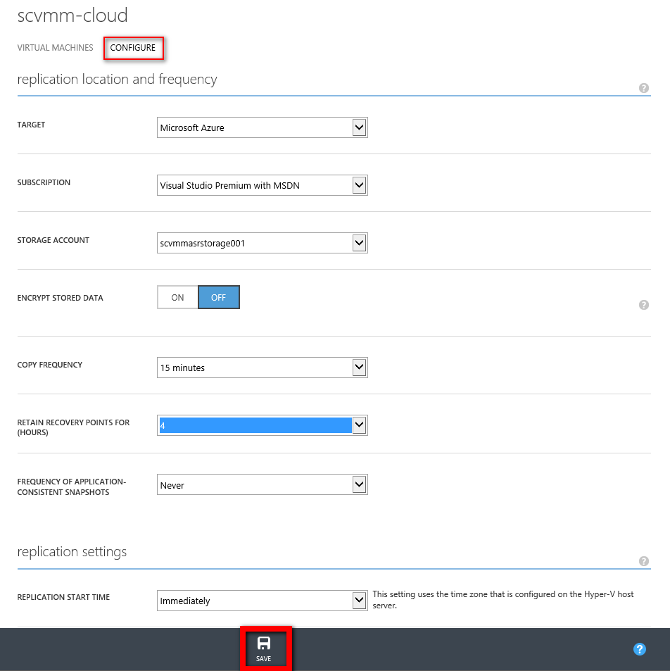 “Configure” başlığı altında replikasyon ayarlarını yapacağız. Burada yapacağımız ayarlar koruyacağımız tüm sanal sunucular için geçerli olacağı için dikkat etmelisiniz. Planlama yaparken Azure üzerine hangi sunucuları, hangi sıklıkla ve ne kadar geriye dönük kopyanız olacak önceden belirlemelisiniz. Ona göre buradan gerekli seçimleri seçmelisiniz.