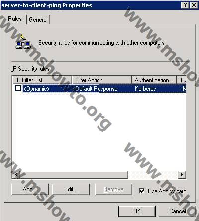 13) Server-to-client-ping properties penceresine kadar OK tuşuna basın. Rules tabına tıklayın. Rules tabında Add tuşuna basmadan önce Use Add Wizard kutucuğunun dolu olduğundan emin olun ve Add tuşuna basın.