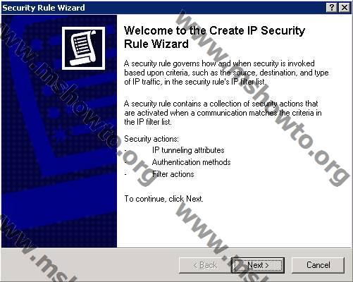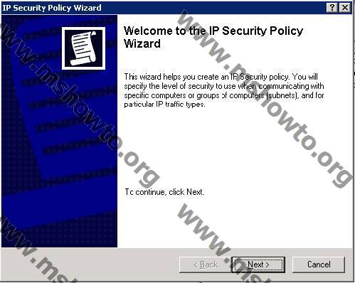 4) IP Security Policy Wizard ekranını Next tuşuna basarak geçin.
