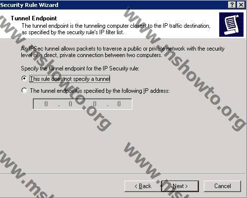 15) Tunnel Endpoint pencerisinde this rule does not specify a tunnel seçeneğini aktif hale getirip Next tuşuna basın. (Bu uygulama da tünel modu kullanılmayacağından bu seçenek aktif hale getirilmiştir.)