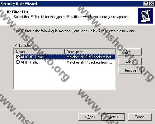 17) IP Filter List penceresinde All ICMP Traffic seçeneğini işaretleyip, Next tuşuna basın. NOT: Tüm IP trafiğini IPSec ile koruma altına alabilmek için All IP Traffic seçeneğini işaretlemeniz gerekir.