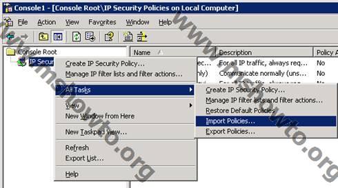 23) Export edilen IPSec policy’i diğer pc’de import işlemini kullanarak policy’i aktif hale getirin. Bunu yapmak için Start, Run, mmc yazın ve IPSecurity on Local Computer’e sağ tıklayın. All Tasks seçeneğinden Import Policies’e tıklayın ve paylaşıma açılmış olan klasörün içinde ipsec_policy.ipsec dosyasına tıklayıp Open tuşuna basın.