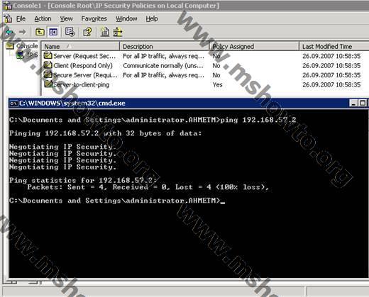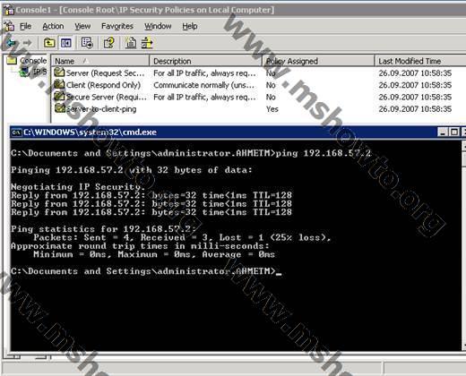 27) Şimdi her iki pc’de policy’i Assign edin. Aşağıdaki Şekilde de görüldüğü gibi ilk ping Negotiating IP Security ile ping in kaybolduğunu ancak bundan sonraki 3 mesajın Reply olarak geri döndüğünü gösterir. Bundan sonra artık bu iki pc’arasındaki tüm ICMP trafiği IPSec ile şifrelenmiştir.