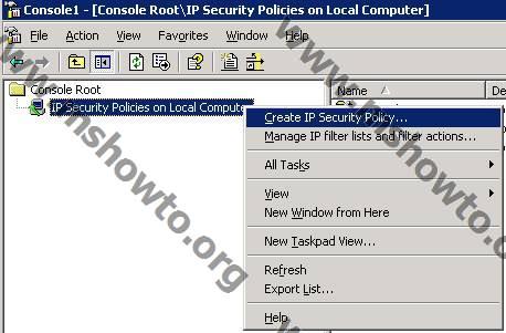3) IP Security Policies on Local Computer’a sağ tıklayın ve Create IP Security Policy seçeneğine tıklayın.