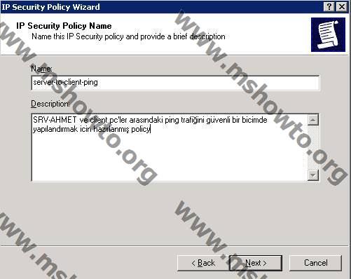 5) IP Security Policy Name penceresinde Name bölümüne policy’nin adını Description bölümüne policy’nin ne için kullanıldığını bildiren bir açıklama yazıp Next tuşuna basın.