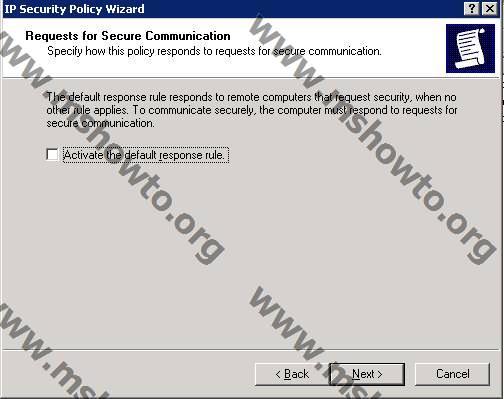 6) Request for Secure Communication bölümündeki Active the Default Response Rule kutucuğunu temizleyip Next tuşuna basın.