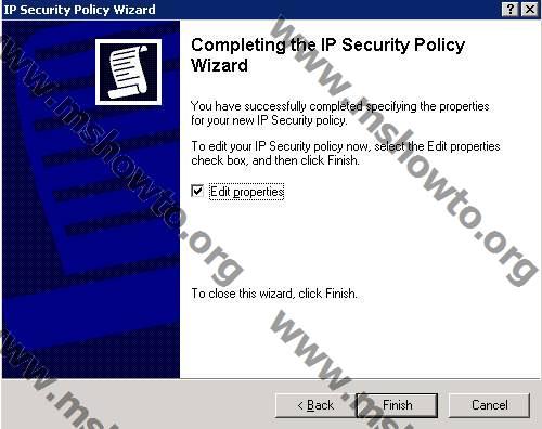 7) Completing IP Security Policy Wizard penceresindeki Edit Properties kutucuğunu işaretleyip Finish tuşuna basarak wizard’ı sonlandırın.