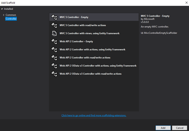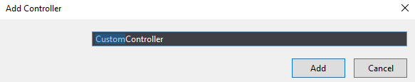 Controller ismini verelim ve Add seçeneğini tıklayıp Controller ekleme işlemini gerçekleştirelim.