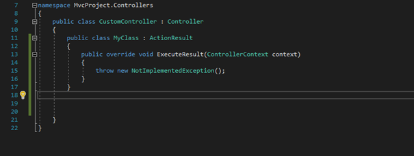 ActionResult nesnesinden türetilen bir Class oluşturalım ve Abstract Class özelliği gösterdiği için içerisinde bulunan metotları Implement edelim.