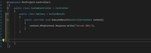 ActionResult nesnesinden gelen metot içerisinde ekrana yazı yazacağımız bir metot kullanalım ve ekrana istediğimiz değeri yazdıralım. Bu ActionResult çağırıldığı zaman bizim yazmış olduğumuz metotları kullanacaktır.
