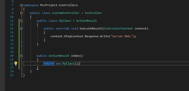 ActionResult içerisinde kendi yazdığımız ActionResult öğesini çağıralım ve projemizi çalıştıralım.