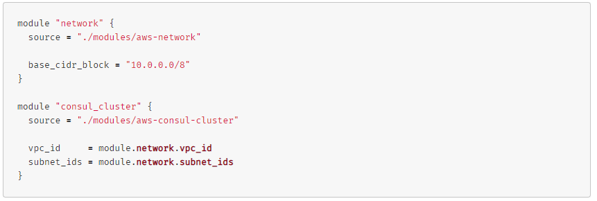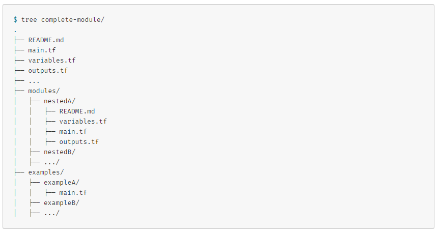 Bir modülü tanımlamak için öncelikle ona bir directory oluşturmak gerekir. Daha sonra ilişkili olan tüm .tf uzantılı dosyalar bu directory içerisine atılabilir. Modüller birbirini çağıracak şekilde konfigüre edilebilirler. Bu durum kullanım şekline göre değişiklik gösterebilir. Ancak önerilen konfigürasyon, modüllerin bireysel olarak tekrarlanacak şekilde kullanılabilmesidir. Bu sebeple farklı kombinasyonlarda modülleri kompozisyonlar halinde kullanmak daha yerinde olacaktır. Bunu da modül tree’lerini düz olarak konfigüre ederek sağlayabilirsiniz. Aşağıda modül kompozisyonuna ait bir örneği görebilirsiniz.