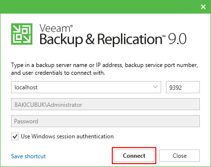 Veeam Backup & Replication v9.0 konsolunu Connect diyerek açıyoruz.
