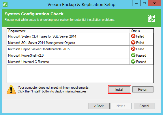 Microsoft System CLR Types for SQL Server 2014, Microsoft SQL Server 2014 Management Objects ve Microsoft Report Viewer Redistributable 2015 yazılımları işletim sistemimiz üzerinde kurulu olmadığı için Failed olarak görünmektedir. Microsoft PowerShell 2.0 Passed ve Microsoft Universal C Runtime işletim sistemimiz üzerinde kurulu olduğu için Passed olarak görünmektedir. Veeam Backup & Replication v9.5 Update 4 kurulumu gerekli yazılımların işletim sistemimiz üzerinde kurulması için Install diyoruz.
