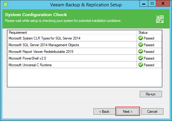 Veeam Backup & Replication v9.5 Update 4 kurulumu için gerekli olan ve işletim sistemi üzerinde kurulu olmayan yazılımların Passed olarak kurulumlarının başarılı bir şekilde tamamlandığını görüyoruz ve Next diyerek devam ediyoruz.