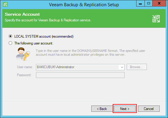 Service Account Credentials ekraninda  Veeam Backup & Replication v9.5 Update 4 kurulumu için ortamınızda Active Directory Domain Services yapılandırması ile yapılandırdıysanız Domain Admin yetkisine sahip bir User ( Kullanıcı ) bilgilerini yazabiliriz. Eğer Active Directory Domain Services yapılandırması yoksa LOCAL SYSTEM account seçeneği ile devam edebiliriz. Biz default olarak gelen LOCAL SYSTEM account (recommended) seçeneğinde herhangi bir değişiklik yapmadan Next diyerek devam ediyoruz.