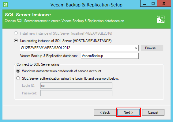 SQL Server Instance ekranında Veeam Backup & Replication v9.0 Database yapısı olarak Microsoft SQL Server Express yazılımını kullanmaktadır. Veeam Backup & Replication v9.0 Update 2 versiyonuna kadar Microsoft SQL Server 2012 Service Pack 1 Express kullanmaktaydı. Veeam Backup & Replication v9.5 Update 4 ile birlikte Microsoft SQL Server 2016 Service Pack 1 Express kullanacaktır. Aslında burada Microsoft SQL Server 2016 Service Pack 1 Express kurulumunun yapılacağını ve mevcut SQL Server Database Update edileceğini görüyoruz.