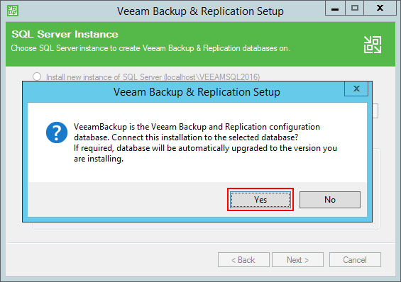 SQL Server Instance ekranında Veeam Backup & Replication v9.5 Update 4 ile birlikte Microsoft SQL Server 2016 Service Pack 1 Express kurulumunun yapılacağını ve mevcut SQL Server Database Update edileceğini uyarısını alıyoruz. Veeam Backup & Replication v9.5 Update 4 Upgrade ( Yükseltme ) işleminin yapılması için Yes diyerek devam ediyoruz.