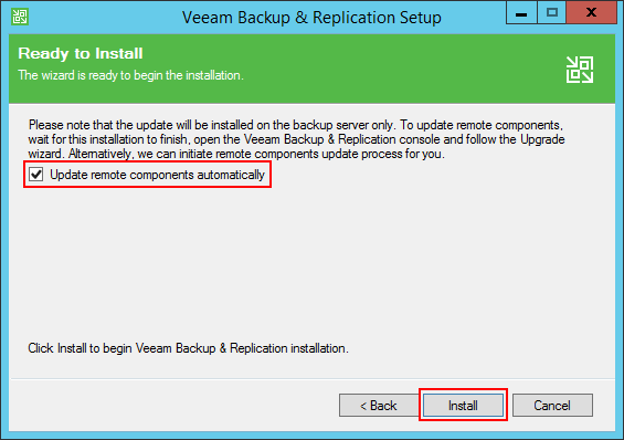Ready to Install ekranında Update remote components automatically seçeneğini işaretliyoruz. Update remote components automatically seçeneği ortamdaki sunucularımız üzerinde gerekli Agent güncelleştirmelerinin otomatik olarak yapılmasını sağlamak için seçtiğimiz bir seçenektir.Install diyerek Veeam Backup & Replication v9.5 Update 4 kurulumu başlatıyoruz.
