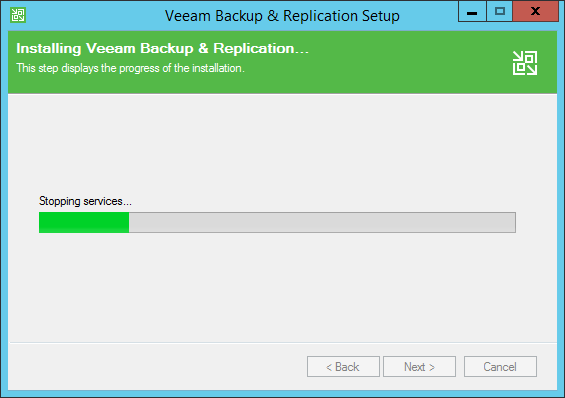 Installing Veeam Backup & Replication… ekranında Veeam Backup & Replication v9.5 Update 4 kurulum işlemi için servislerin Stopping services… olduğunu görüyoruz.