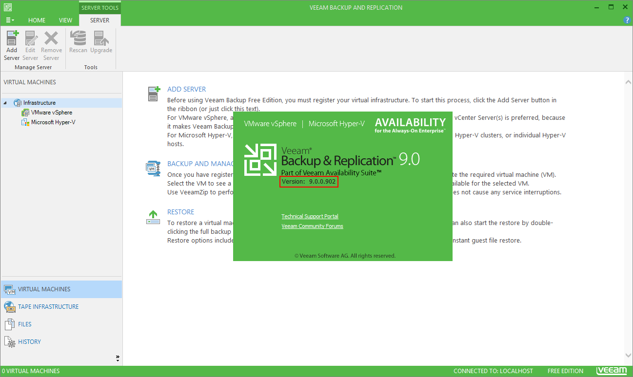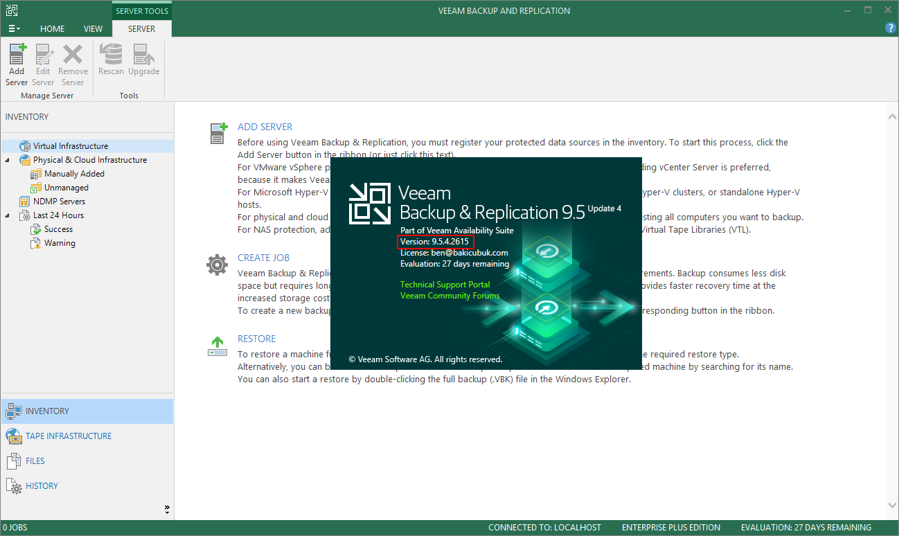 Veeam Backup & Replication v9.0 konsolunda Help menüsü altında bulunan About sekmesinden versiyonu kontrol ediyoruz. Veeam Backup & Replication v9.0 versiyonun 9.0.0.902 olarak görüyoruz.