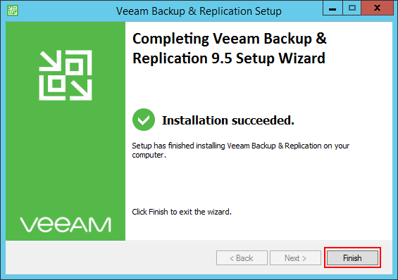 Completing Veeam Backup & Replication Setup Wizard ekranında Veeam Backup & Replication v9.5 Update 4 kurulumunun başarılı bir şekilde tamamlandığını görüyoruz. Finish diyerek Completing Veeam Backup & Replication Setup Wizard ekranını kapatıyoruz.