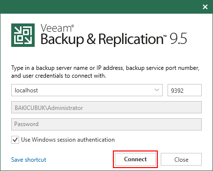 Veeam Backup & Replication v9.5 Update 4 kurulumu tamamlandıktan sonra Desktop ( Masaüstü ) üzerindeki Veeam Backup & Replication v9.5 Update 4 konsoluna tıklayarak Veeam Backup & Replication v9.5 Update 4 çalıştırıyoruz.Veeam Backup & Replication v9 sonrasında gelen bu özellik ile herhangi bir makina üzerine Veeam Backup & Replication Console kurulumunu yaparak yönetebiliyoruz. Connect diyerek Veeam Backup & Replication v9.5 Update 4 çalıştırıyoruz.