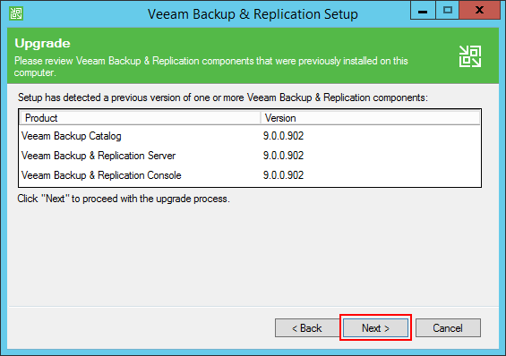 Upgrade ekranında Veeam Catalog, Veeam Backup & Replication Server ve Veeam Backup & Replication Console versiyonlarını Veeam Backup & Replication 9.0.0.90 olarak görüyoruz ve Next diyerek devam ediyoruz.