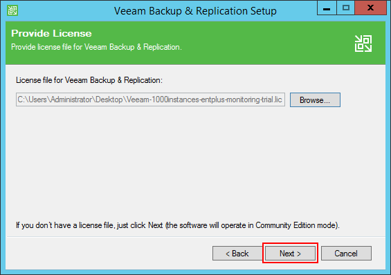 Provide License ekranında Veeam Backup & Replication v9.5 Update 4 için satın almış olduğunuz .lic uzantılı lisans dosyanızı Browse diyerek ekleyebilirsiniz. Dilerseniz Veeam Backup & Replication v9.5 Update 4 kurulumu tamamladıktan sonra Veeam Backup & Replication v9.5 Update 4 konsolu üzerinden lisansınızı ekleyebilirsiniz.