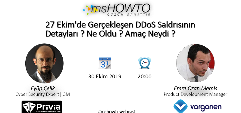 27 Ekim tarihinde gerçekleşen ve etkisini ertesi güne kadar sürdüren DDoS saldırısının detaylarını konu uzmanı iki yazarımız  yorumluyor. Saldırının başladığı andan itibaren tüm süreci yakından takip eden Privia Security kurucusu ve Siber Güvenlik Uzmanı Eyüp Çelik ile Vargonen Teknoloji Ürün Geliştirme Yöneticisi Emre Ozan Memiş yarın akşam saat 20:00’da MSHOWTO Youtube kanalımızda DDoS Saldrısının Detaylarını ? Ne Oldu ? Amaç Neydi ? gibi soruların cevaplarını sizlerle paylaşacaklar.