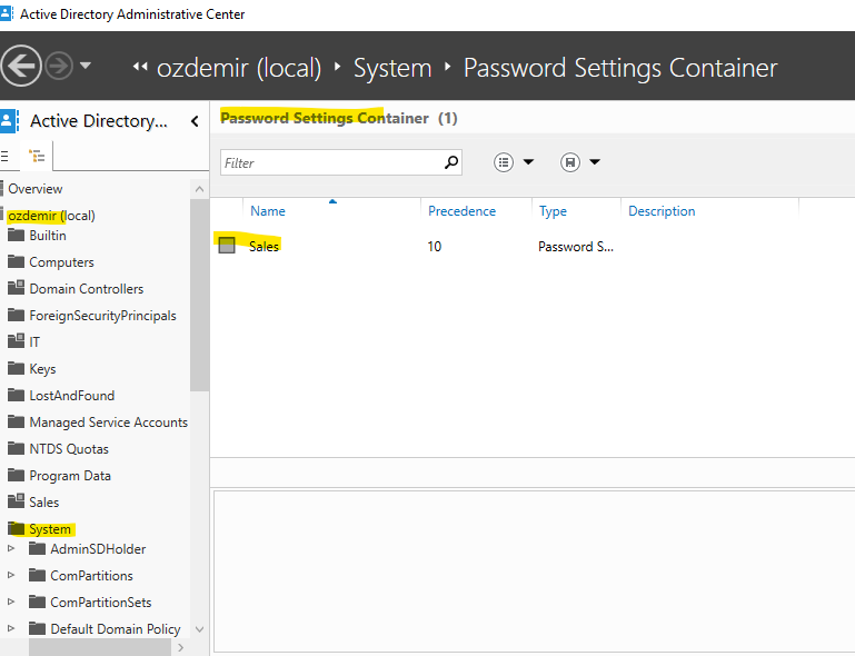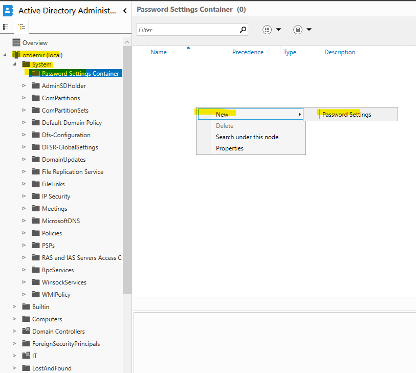Domain Adımızın altında, System, Password Settings Container içersinde New à Password Settings diyerek belirlediğiniz kullanıcı veya gruplarınıza özel password policy’ler belirleyebilirsiniz.