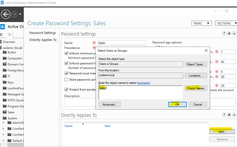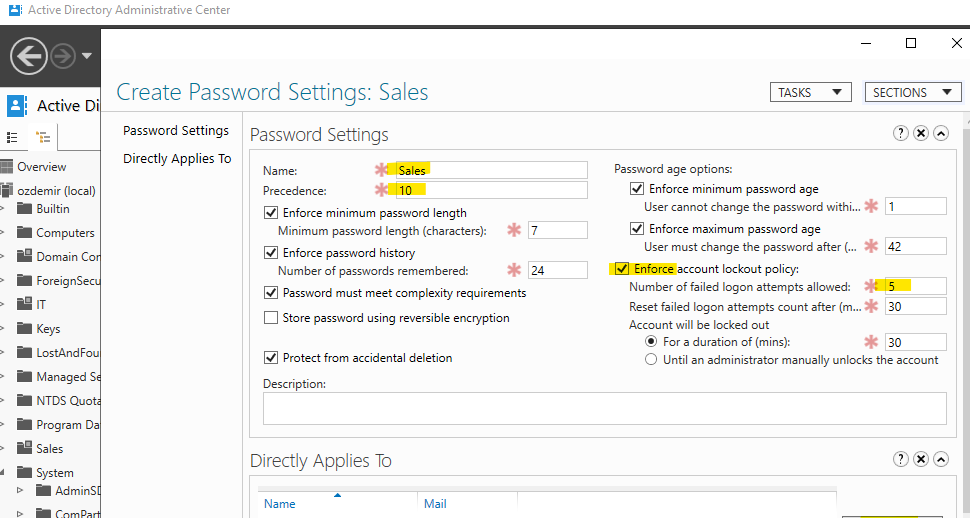 Örnek bir Fine Grained Password Policy tanımlamalarını aşağıdaki yapabilirsiniz.