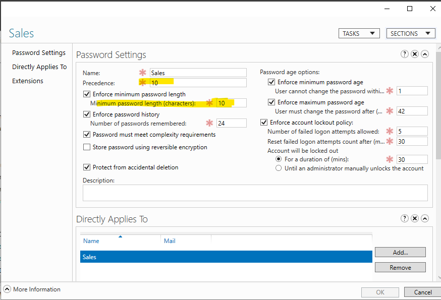 Name kısmında herhangi bir isim verdikten sonra Precedence değerine örnek olarak 10 giriyorum. Bu değer bir kullanıcı 2 farklı grubun üyesi ise ve bir policy’de şifresinin min. 10 karakter olması için bir tanımlama varsa ve ayrıca aynı kullanıcının farklı bir policy’de 12 karakter tanımlaması varsa burda Precedence değeri düşük olan değeri baz alarak password policy uygulanacaktır.